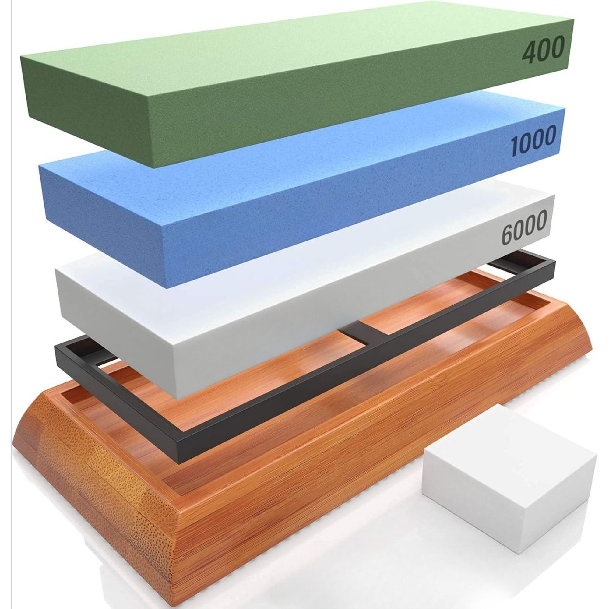 Extra Large Whetones : Larger, thicker, oversized stones measure 8-inch x 2 3/4 inch and at a full 1-inch thickness, along with a flattening stone they have plenty of service life in them & are easy to use. These wet stones uses Water for sharpening, so no need of using expensive sharpening/honing oilsComplete Sharpening Kit : This kit comes with 3 Grit 400/1000/6000 sharpening stones set well designed to achieve Razor Sharp Edge. The 400 grit is an aggressive stone for Dull Edges. The 1000 grit is used after the 400 or as a starting point for only moderately dull edges. The 6000 grit is a very fine stone and provides a very polished edge that will cut extremely well. It also includes handmade NonSlip Bamboo base making it a robust sharpening systemWhetstone Flattener: Over time, your sharpening stones for knives will naturally become uneven, making it impossible to get ultra sharp razor edge. whetstone flattener is designed to keep your sharpening stones flawlessly flat and ready to use in just minutes. With timely use of flattening stone & leveling the grinding stones surfaces, these knife sharpening set should last you a lifetimePeak Performance : Our Premium Whetstone Knife Sharpener Stones Set are Larger, Thicker, Well Balanced & allows precision knife sharpening without excessive resurfacing. These wetstone set can sharpen Any Blade out there, be it any kitchen knives, chef knife, steak knife, sontoku knife, paring knife, sushi knife, cleaver knife,Diving knife, Machete, Hunting Knife Sharpener, Pocket Knife Sharpener, Blade sharpener & it can even sharpen a dull SwordPrecision Sharpening : Not all knife sharpening stones set are created equal. We only source premium quality material for the manufacturing of our whetstone which will provide superior cutting performance. This tool is used by everyone, from home cooks, stay-at-home moms and DIY enthusiasts to seasoned professionals, making it a thoughtful and practical gift for family and friends