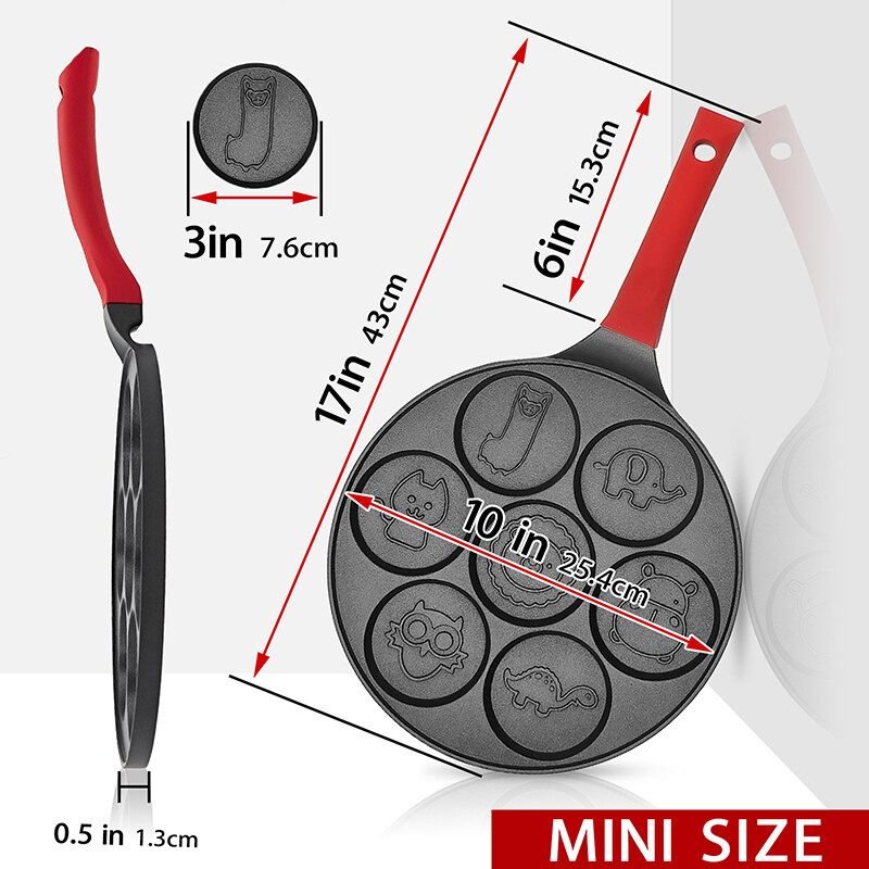 Nonsticky Pan Coating- Our pan is coated with 100% PFOA free non-stick coating in cute healing color, not only baking for teenagers and kids but also make yourself relaxing when you flip those pancakes 7 Pancake Maker - 3-Inch flapjack pancake maker for blinis and crepes in fun shapes with this holiday pancakes molds. 7 pancake mood : Elephant, Alpaca, Cat,owl, Dinosaur, hippo, lion PREMIUM MATERIAL: Made of die cast Aluminum, 10 inches diameter and 1/2 inches height, each cavity measure 3 inches. 17 Inches length including the silicone handle BROAD COOK TOP VERSATILITY: Heavy duty pan works on Gas, Halogen, Ceramic Cook tops, stove grill ; Use for pancakes, crepes, blinis & blintzes Induction Cook tops Not Applicable ! Do not put in dishwasher as it will shorten the life of the nonstick coating on the pan and may dull the exterior of the pan