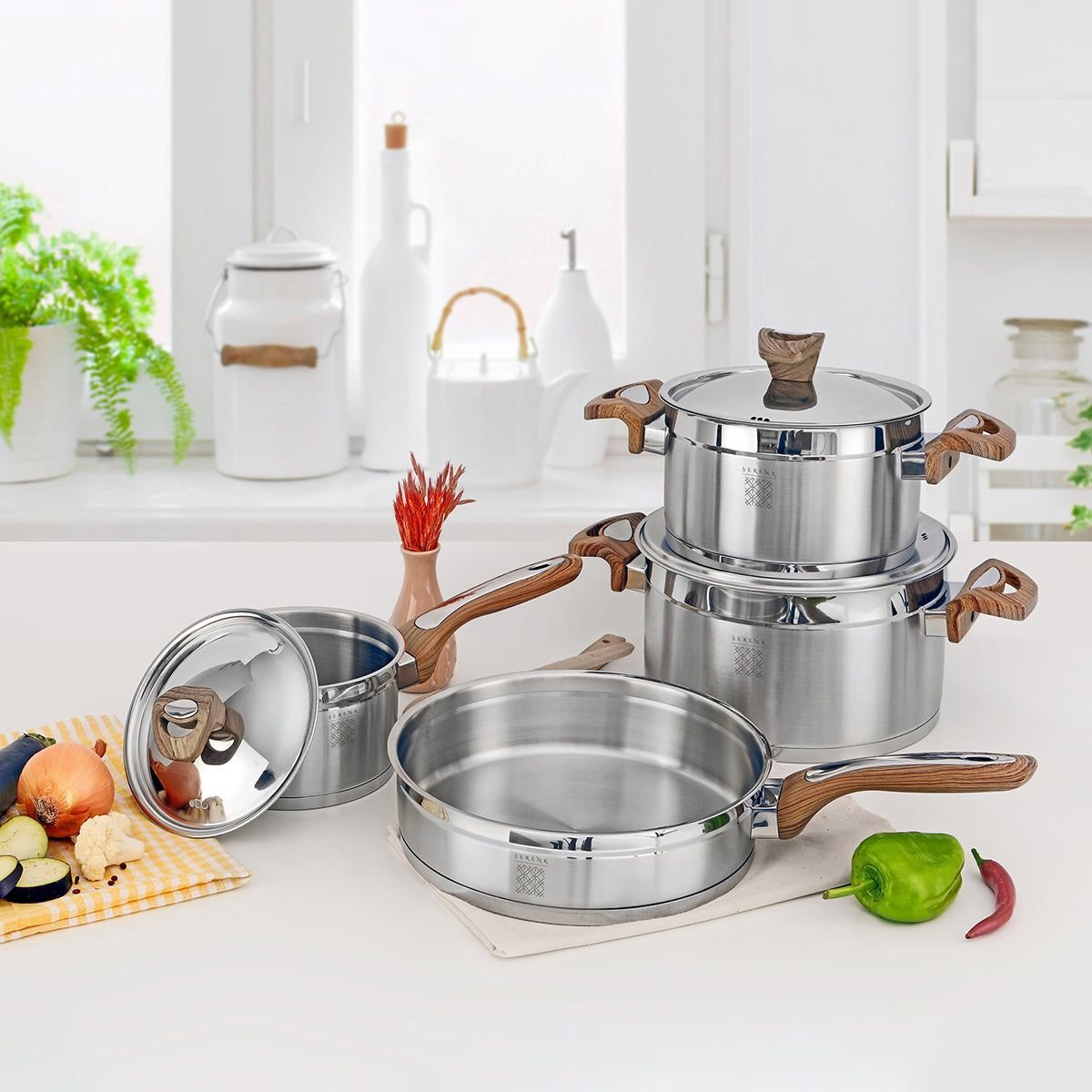 SERENK DEFINITION 7 PIECES COOKWARE SET: Serenk cookware set is made from 18/10 stainless-steel which exceedingly resistant to scratches, staining and will maintain its performance for a lifetime. Tight-fitting steel lids seal in true nutrients and moisture for tender, succulent dishes. Heat resistant handles has a safe connection which will keep them tight for all time.
