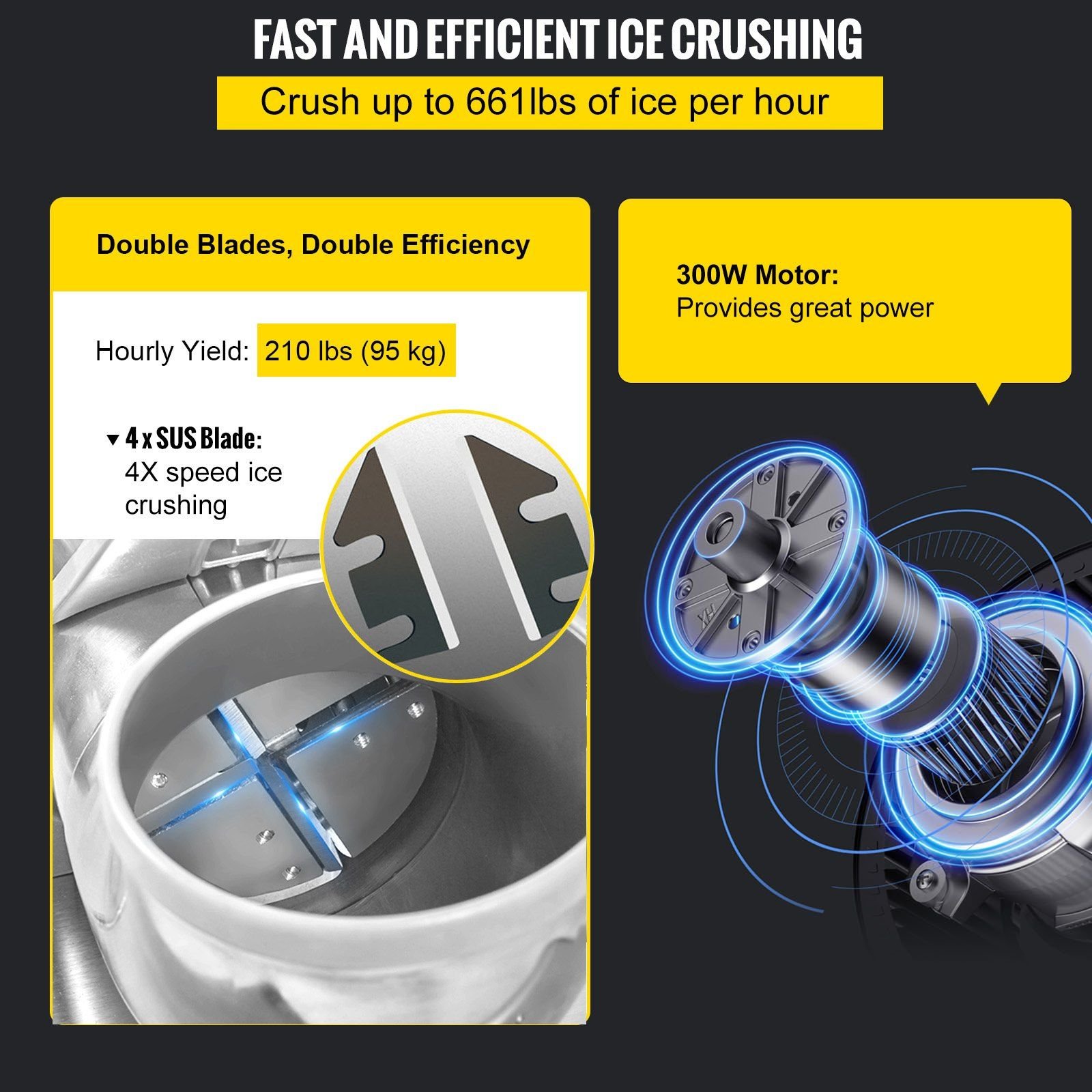 1.HIGHER CRUSHING EFFICIENCY- Our electric ice shaver features a higher ice shaving efficiency and hourly yield thanks to the dual-blade design, on the strength of which it can double the efficiency of ice shaving compared to those with a single one. Fueled by the 300W copper motor, whose rotating speed reaches 1450 r/min, our shaved ice maker can produce 210 lbs (95 kg) per hour, meeting the urgent demands quickly in a short time. Besides, another blade is provided for replacement.