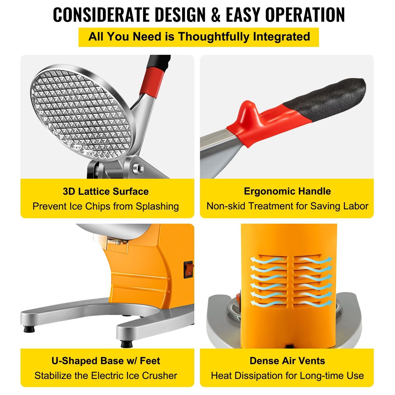 The disc fits the ice inlet perfectly, effectively avoiding ice chips from splashing. A non-skid sleeve is wrapped on the end of the labor-saving handle. The U-shaped base with rubber feet can enhance the stability of the machine. And the dense air vents for heat dissipation is for extending the motor's service life.